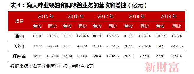海天味業(yè)的另外兩個主要業(yè)務(wù),蠔油和調(diào)味醬,收入也保持著較高速度的增長,尤其是蠔油(表4)。