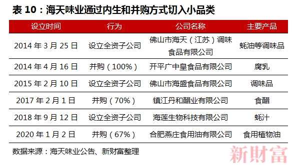 近年來,海天開始實(shí)施產(chǎn)品多元化戰(zhàn)略,涵蓋醋、雞精、味精、料酒、腐乳等品類,并于2017年、2020年分別入股丹和醋業(yè)、合肥燕莊(表10)。