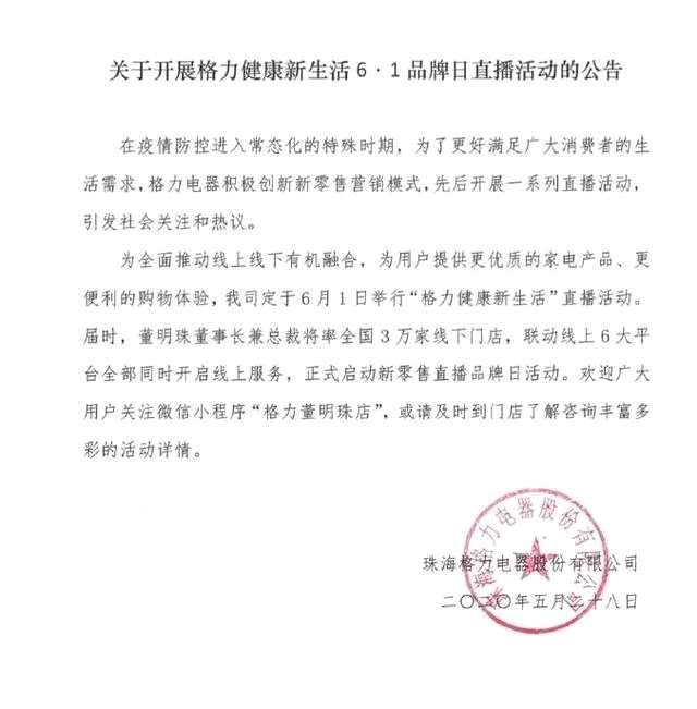 近日,格力電器(000651)發(fā)布公告稱,格力將于6月1日舉行“格力健康新生活”直播活動(dòng),格力電器董事長(zhǎng)董明珠將攜3萬(wàn)家線下門店全員進(jìn)行直播,全面推動(dòng)線上線下的有機(jī)融合,為用戶提供更優(yōu)質(zhì)的家電產(chǎn)品。