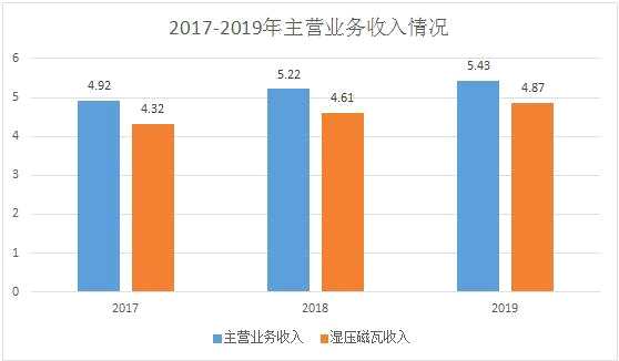 有了技術(shù)和產(chǎn)品創(chuàng)新的保證,永磁鐵氧體濕壓磁瓦這樣一個王牌產(chǎn)品長期以來貢獻了龍磁科技的大部分營收,其穩(wěn)定的業(yè)績貢獻讓龍磁科技近年營收穩(wěn)定上升。2017-2019年,濕壓磁瓦分別貢獻了4.32、4.61、4.87億元營業(yè)收入,占同期主營業(yè)務(wù)收入的比例分別為87.79%、88.35%和89.65%。同期,主營業(yè)務(wù)收入分別為4.92億元、5.22億元、5.43億元,增速與行業(yè)持平。