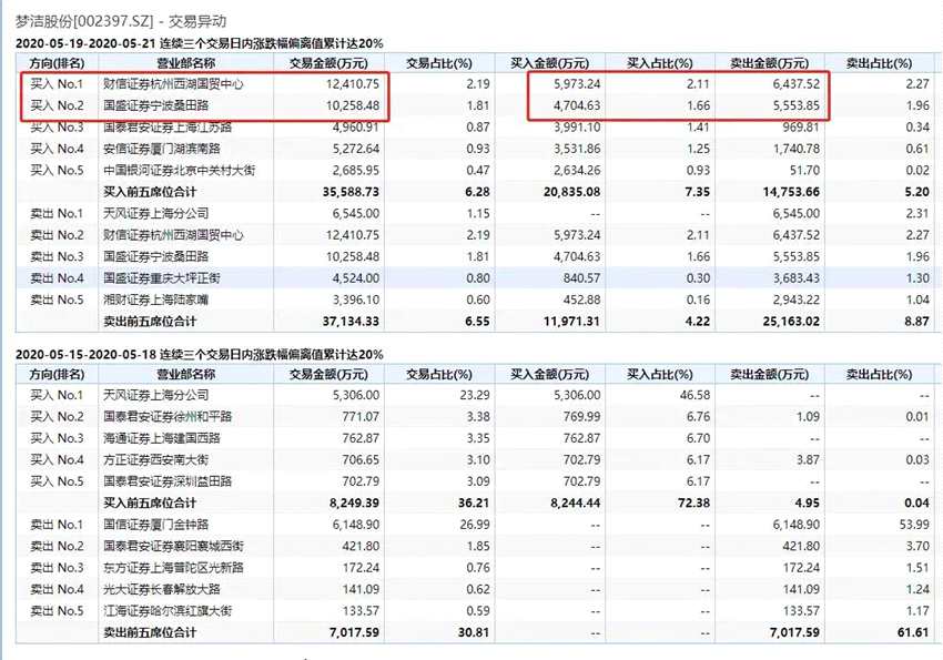 龍虎榜顯示,5月19日-5月21日期間,財(cái)信證券杭州西湖國(guó)貿(mào)中心營(yíng)業(yè)部、國(guó)盛證券寧波桑田路營(yíng)業(yè)部交易金額均過億元。