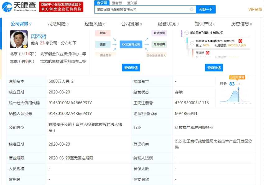 天眼查數(shù)據(jù)顯示,湖南同有飛驥科技有限公司成立于2020年3月,注冊資本5000萬元,經(jīng)營范圍包括大數(shù)據(jù)處理技術(shù)的研究、開發(fā);計算機(jī)技術(shù)開發(fā)、技術(shù)服務(wù);信息科技技術(shù)、軟件的開發(fā);計算機(jī)外圍設(shè)備制造(限分支機(jī)構(gòu))。