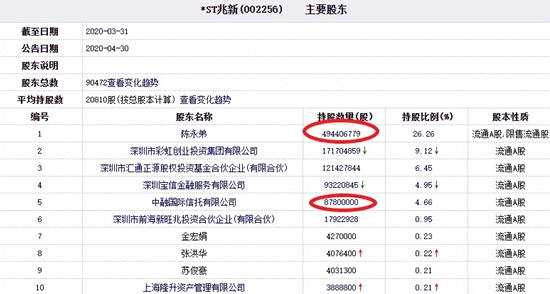 互聯(lián)網(wǎng)記者查詢發(fā)現(xiàn),截至2020年3月31日,陳永弟為*ST兆新第一大股東,持股4.94億股,持股比例26.26%;中融國際信托有限公司為第五大股東,持股8780萬股,持股比例4.66%。
