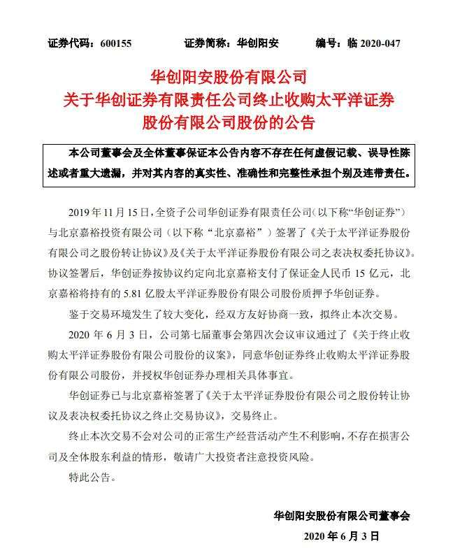 6月3日晚間,【華創(chuàng)陽安(600155)、股吧】(600155)發(fā)布公告稱,公司董事會同意華創(chuàng)證券(華創(chuàng)證券為華創(chuàng)陽安全資子公司)終止收購太平洋證券股份事項。