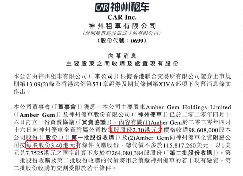 此前神州優(yōu)車與Amber Gem Holdings Limited簽訂的協(xié)議中,占比不到30%的第一批股份轉(zhuǎn)讓價格為2.3港幣,占比超過70%的第二批股份轉(zhuǎn)讓價格為3.4港幣。