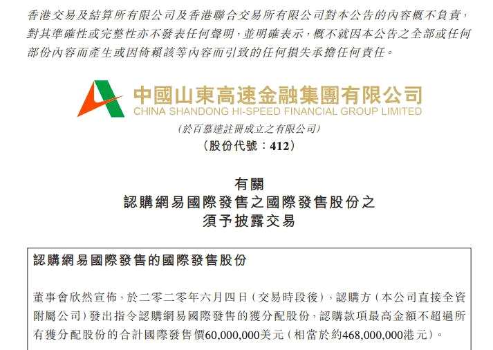 6月5日,中國(guó)山東高速(600350)金融披露,于2020年6月4日交易時(shí)段后,公司之直接全資附屬公司中國(guó)山東高速資本有限公司發(fā)出指令認(rèn)購(gòu)網(wǎng)易(09999-HK)國(guó)際發(fā)售的獲分配股份,認(rèn)購(gòu)款項(xiàng)最高金額不超過(guò)所有獲分配股份的合計(jì)國(guó)際發(fā)售價(jià)6000萬(wàn)美元(約4.68億港元)。