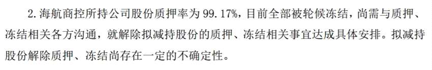 原來,海航商控所持上市公司股份質(zhì)押率高達99.17%,目前全部被輪候凍結(jié)。如此看來,海航商控不是不想減,而是根本減不了。
