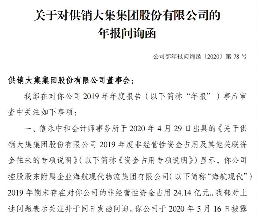 此外,供銷大集還曝出被控股股東附屬企業(yè)海航現(xiàn)代占用非經(jīng)營性資金24.14億元,并因此收到深交所的年報問詢函。