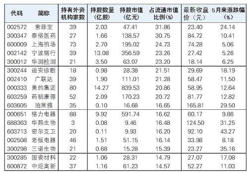 摘要: 5月份以來,外資布局A股的步伐穩(wěn)步推進(jìn)。大眾證券報(bào)統(tǒng)計(jì)顯示,截至本周四,外資持股占流通市值比例超過一成的股票有58只,其中5月份以來獲得5%以上正收益的有33只。
