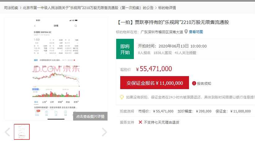 6月8日,搜狐財(cái)經(jīng)獲悉,北京市第一中級(jí)人民法院定于6月13日至14日拍賣賈躍亭持有的2210萬股樂視網(wǎng)股票,起拍價(jià)為5547.1萬元。