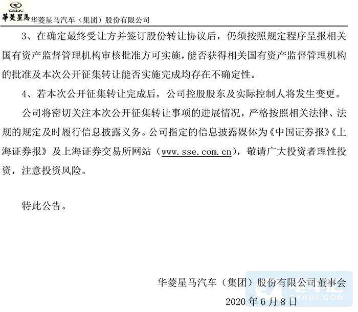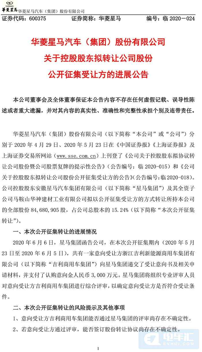 6月7日,華菱星馬(600375)發(fā)布公告稱,控股股東擬轉(zhuǎn)讓公司股份公開征集受讓方事項(xiàng)取得進(jìn)展,公開征集期內(nèi),意向受讓方吉利商用車集團(tuán)向控股股東星馬集團(tuán)遞交了受讓意向書及相關(guān)申請(qǐng)材料,并支付了認(rèn)購(gòu)意向金3000萬元。星馬集團(tuán)將確定意向受讓方是否符合受讓條件。