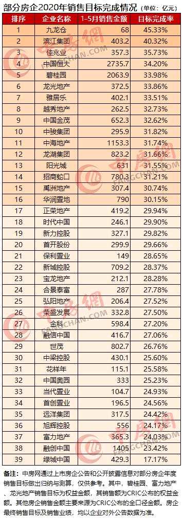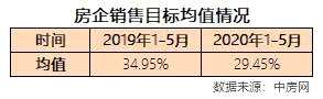 根據中房網不完全統計,按照已公布2020年銷售目標39家房企,結合克而瑞研究中心監(jiān)測的銷售數據測算,已公布銷售目標的房企前五月銷售目標完成率接近三成,均值為29.45%,相比前四月整體提升了9.39個百分點,但與去年同期34.95%的銷售目標完成率相比,仍顯遜色。