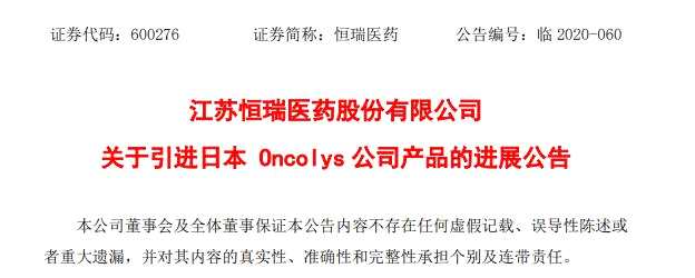 昨日,江蘇 恒瑞醫(yī)藥(600276) 股份有限公司發(fā)布公告稱:本公司與日本Oncolys公司協(xié)商一致,決定終止有關(guān)溶瘤腺病毒產(chǎn)品TelomelysinTM(OBP-301)的相關(guān)合作并簽署了終止協(xié)議。