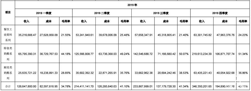 問(wèn):即食類奶酪系列、廚房類奶酪系列和餐飲工業(yè)原料系列奶酪,不同季度營(yíng)收和毛利率情況。