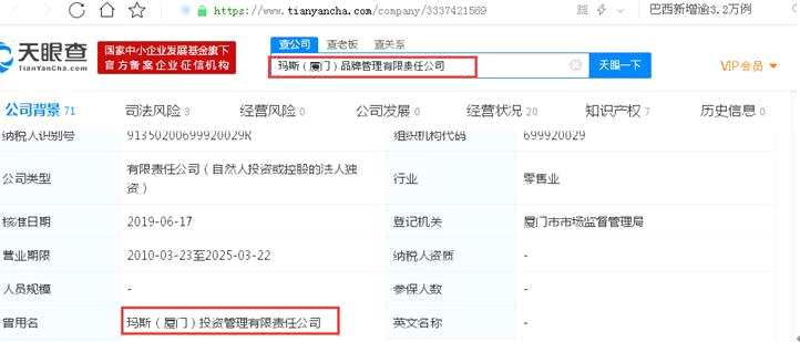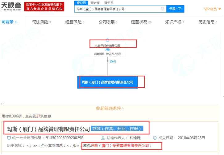 據(jù)天眼查、國家企業(yè)信用信息公示系統(tǒng)顯示,瑪斯(廈門)投資管理有限責任公司(現(xiàn)用名:瑪斯(廈門)品牌管理有限責任公司)為九牧王(601566)股份有限公司全資子公司,注冊資本為5000萬元。經(jīng)營范圍包括服裝業(yè)的投資及管理,服裝、鞋帽銷售,經(jīng)營各類商品和技術的進出口。