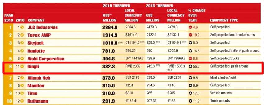 浙江鼎力獲“2019全球高空作業(yè)平臺(tái)制造企業(yè)20強(qiáng)”全球第六