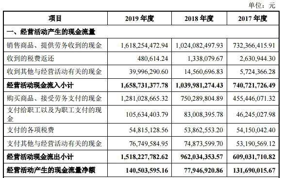 2016年-2019年,三人行營業(yè)收入分別為3.69億元、7.58億元、11.00億元、16.31億元,銷售商品、提供勞務收到的現金分別為3.28億元、7.32億元、10.24億元、16.18億元,歸屬于母公司所有者的凈利潤分別為7255.33萬元、9776.27萬元、1.24億元、1.94億元,經營活動產生的現金流量凈額分別為6590.56萬元、1.32億元、7794.69萬元、1.41億元。