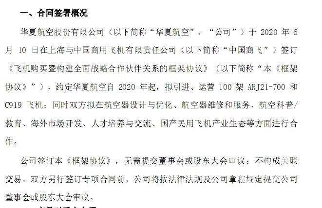 6月14日,記者從【華夏航空(002928)、股吧】(002928)獲悉,6月10日,華夏航空和中國商用飛機(jī)有限責(zé)任公司(“中國商飛”)簽訂戰(zhàn)略合作框架協(xié)議,自2020年起,華夏航空擬引進(jìn)、運(yùn)營100架ARJ21-700和C919飛機(jī)。同時(shí),6月10日,華夏航空公司還發(fā)布了關(guān)于與中國商飛簽訂戰(zhàn)略合作框架協(xié)議的公告。