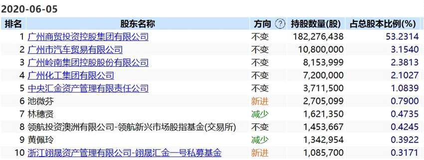 6月12日,廣百股份披露的股東榜顯示,4月初至6月5日,新進(jìn)入公司前十大股東榜的股東有兩名,分別是池微芬和浙江翊晟資產(chǎn)管理有限公司-翊晟匯金一號(hào)私募基金,池微芬停牌前持股量達(dá)到270.5萬(wàn)股,占比0.79%,為第六大股東,翊晟匯金一號(hào)私募基金持有108.57萬(wàn)股,占比0.32%,為第十大股東。