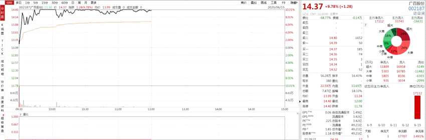 隨后,廣百股份迅速走高,不到十點(diǎn)就已封在漲停板,此后雖然頻頻開(kāi)板、封板,再開(kāi)板,再封板,但截至中午收盤(pán),公司股價(jià)依然為14.37元/股,漲幅為9.78%。