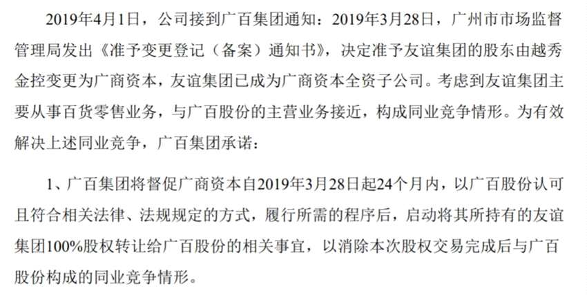 一年前公司對(duì)該起重組就有過(guò)預(yù)告。2019年4月,廣百股份披露收到廣百集團(tuán)通知,將督促?gòu)V商資本將其持有的友誼集團(tuán)100%股權(quán)轉(zhuǎn)讓給廣百股份,時(shí)間期限為2年。