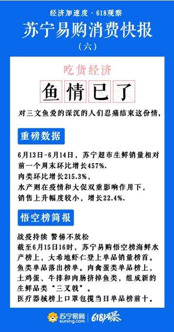 摘要: 最近北京新增病例的新聞讓人們對(duì)疫情防控的警惕心再次加強(qiáng),蘇寧易購(gòu)(002024)的銷售數(shù)據(jù)顯示出了微妙的變化,肉禽蛋銷售上揚(yáng),水產(chǎn)增幅放緩;口罩再次霸占蘇寧易購(gòu)悟空榜醫(yī)療器械單品銷量前十。