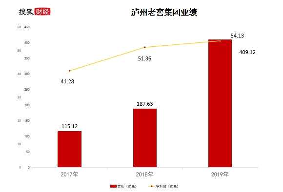經(jīng)審計(jì)的財(cái)報(bào)顯示,2017年至2019年,瀘州老窖集團(tuán)營(yíng)收分別為115.12億元、187.63億元和409.12億元,同比增長(zhǎng)29%、63%、119%,2019年實(shí)現(xiàn)翻倍增長(zhǎng)。
