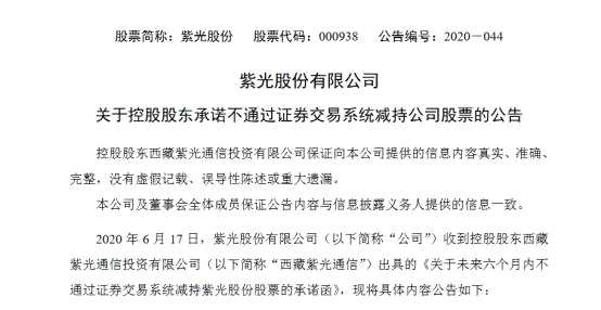 6月17日收盤(pán)之后, 紫光股份(000938)發(fā)布《關(guān)于控股股東承諾不通過(guò)證券交易系統(tǒng)減持公司股票的公告》,