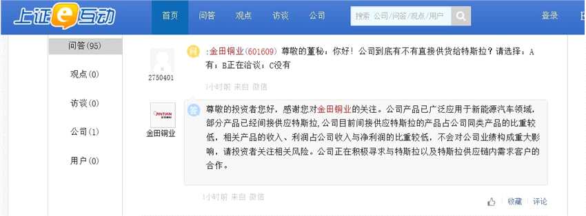金田銅業(yè):產(chǎn)品已廣泛應(yīng)用于新能源汽車領(lǐng)域 部分產(chǎn)品已經(jīng)間接供應(yīng)特斯拉