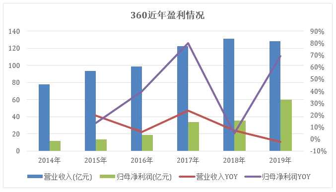 至2019年,360全年實現(xiàn)營收128.41億,同比下滑2.2%;實現(xiàn)歸母凈利潤59.8億,同比增長69.2%。然而,凈利潤的大幅增長主要得益于轉(zhuǎn)讓奇安信股權,扣除這部分非經(jīng)常性損益后,360的凈利潤較去年僅增加3%。