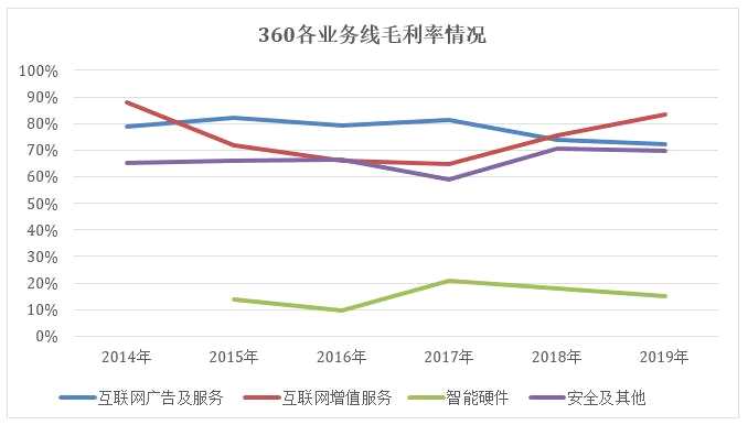 但從毛利率來看,互聯(lián)網(wǎng)廣告業(yè)務近兩年毛利率較之前年份明顯下滑。2014-2017年,該板塊業(yè)務毛利率維持在80%左右,2018年陡然下降7.65個百分點至73.78%。2019年360互聯(lián)網(wǎng)廣告業(yè)務的毛利率為72%,再次較去年減少1.78個百分點。