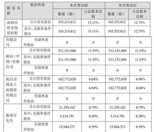 減持后,歐菲控股合計(jì)持有股份3.44億股,占總股本比例12.75%;裕高(中國)有限公司合計(jì)持有股份3.11億股,占總股本比例11.55%;南昌市國金工業(yè)投資有限公司合計(jì)持有股份1.63億股,占總股本比例6.04%;蔡榮軍合計(jì)持有股份2125.92萬股,占總股本比例0.79%,其中無限售條件股份531.48萬股,占總股本比例0.20%,有限售條件股份1594.44萬股,占總股本比例0.59%。