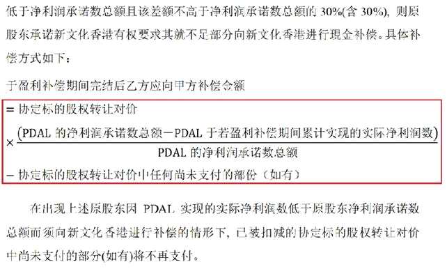 公告顯示,PDAL原股東 周星馳 需承諾公司在2016-2019四個財政年度實現(xiàn)的 凈利潤 合計10.4億元人民幣,其中2016財政年、2017財政年、2018財政年和2019財政年實現(xiàn)的 凈利潤 分別不低于人民幣1.7億元、2.21億元、2.873億元和3.617億元;實際 凈利 潤數(shù)不足 凈利潤 承諾數(shù)的部分由原股東 周星馳 進行現(xiàn)金補償及回購。
