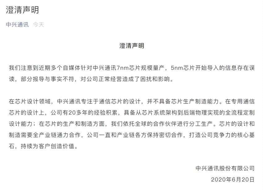 中興通訊澄清自媒體有關(guān)芯片報道:與事實不符