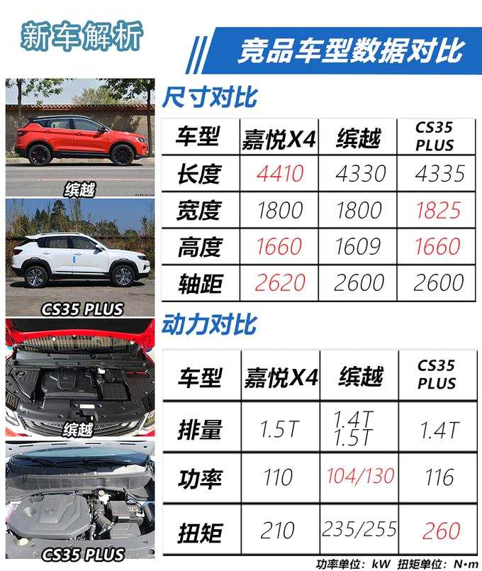 嘉悅X4動(dòng)力方面搭載一臺(tái)1.5T渦輪增壓發(fā)動(dòng)機(jī),最大功率110kW,最大扭矩210N·m。傳動(dòng)系統(tǒng)方面,與之匹配的是CVT變速箱或6擋手動(dòng)變速箱。嘉悅X4和它的競(jìng)品車型吉利繽越、長(zhǎng)安CS35 PLUS相比動(dòng)力上還是有些偏弱,但是它在空間表現(xiàn)上非常優(yōu)秀。
