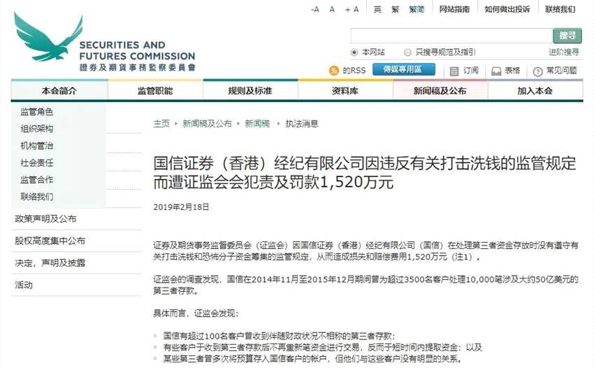 2019年2月18日,香港證監(jiān)會(huì)披露,因違反有關(guān)打擊洗錢(qián)的監(jiān)管規(guī)定,國(guó)信證券(香港)遭香港證監(jiān)會(huì)罰款1520萬(wàn)元。