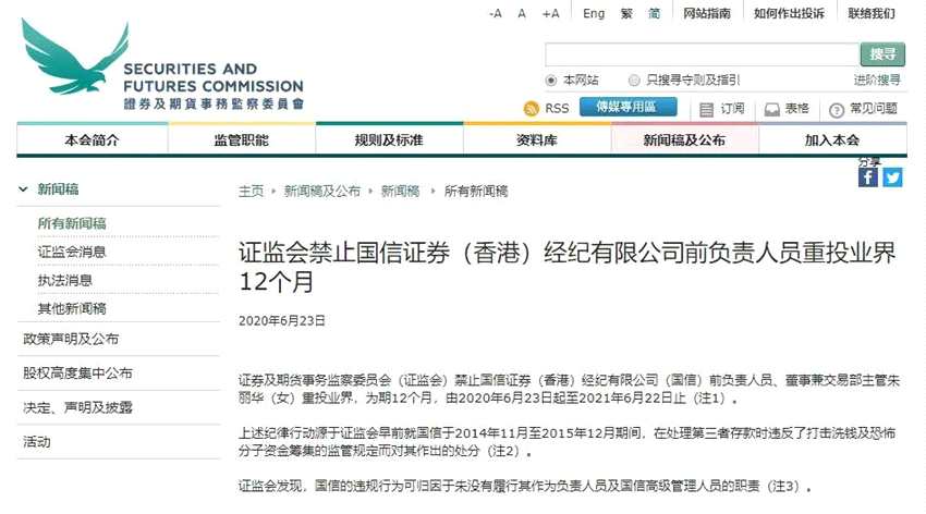 6月23日,香港證監(jiān)會(huì)官網(wǎng)顯示,禁止國(guó)信證券(002736)(香港)經(jīng)紀(jì)有限公司(下稱(chēng)“國(guó)信證券(香港)”)前負(fù)責(zé)人員、董事兼交易部主管朱麗華重投業(yè)界,為期12個(gè)月,由2020年6月23日起至2021年6月22日止。