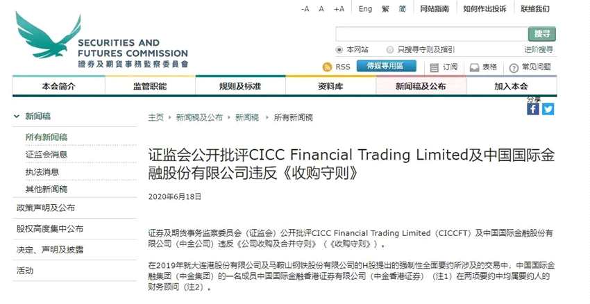 6月17日,香港證監(jiān)會(huì)在官網(wǎng)公開(kāi)批評(píng)CICCFT及中金公司違反《收購(gòu)守則》。而CICCFT為中金公司的全資子公司。