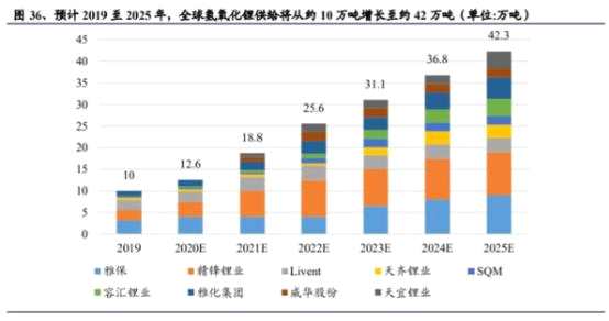 2025年氫氧化鋰預(yù)計(jì)總產(chǎn)量約42萬噸,其中2020-2025 年供給總增量分別約2.6萬噸、6.2萬噸、6.8萬噸、5.5萬噸、5.7萬噸、5.5萬噸。