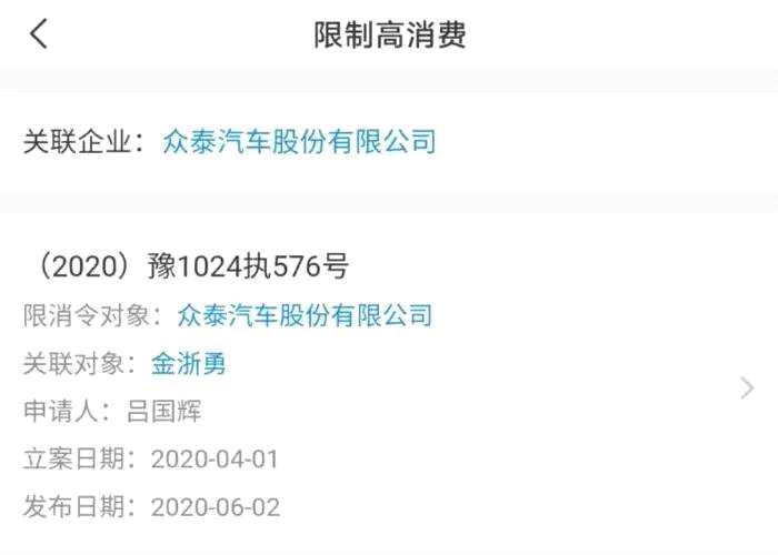 眾泰汽車法定代表人金浙勇被限制高消費(fèi)。數(shù)據(jù)來(lái)自企查查。