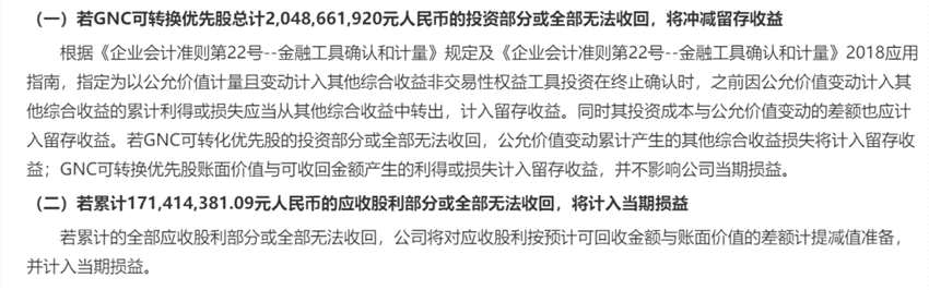 1、若GNC可轉(zhuǎn)換優(yōu)先股總計2,048,661,920元的投資部分或全部無法收回,將沖減留存收益。