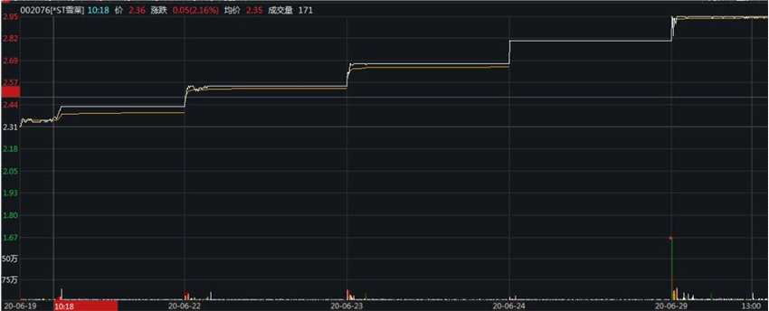 今天*ST雪萊(002076)開(kāi)盤(pán)報(bào)2.95元,截止09:30分,該股漲4.98%報(bào)2.95元,觸及漲停板,之后雖然多次打開(kāi)漲停,但截至午間收盤(pán)仍封上漲停板,總市值22.54億元。至此,*ST雪萊已連續(xù)五天漲停,期間股價(jià)增加30%。