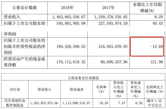 上市第二年,常熟汽飾扣非凈利潤(rùn)下滑,主營(yíng)業(yè)務(wù)毛利率持續(xù)下滑。2018年年報(bào)顯示,公司實(shí)現(xiàn)營(yíng)業(yè)收入14.64億元,較上年同期增長(zhǎng)9.29%;實(shí)現(xiàn)歸屬于上市公司股東的凈利潤(rùn)3.40億元,較上年同期增長(zhǎng)49.43%;實(shí)現(xiàn)歸屬于上市公司股東的扣除非經(jīng)常性損益的凈利潤(rùn)1.89億元,較上年同期減少12.69%;經(jīng)營(yíng)活動(dòng)產(chǎn)生的現(xiàn)金流量?jī)纛~為1.79億元,較上年同期增長(zhǎng)121.98%;公司主營(yíng)業(yè)務(wù)汽車(chē)零部件及配件制造業(yè)毛利率為18.39%,較上年同期減少1.34個(gè)百分點(diǎn)。