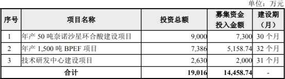 中欣氟材上市時披露的公告書顯示,公司上市發(fā)行股份數(shù)量為2800萬股,募集資金總額為1.80億元,扣除發(fā)行費用后募集資金凈額為1.45億元,分別用于“年產(chǎn)50噸奈諾沙星環(huán)合酸建設(shè)項目”、“年產(chǎn)1500噸BPEF項目”、“技術(shù)研發(fā)中心建設(shè)項目”。
