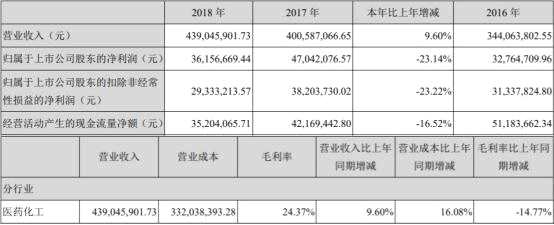 上市第二年,中欣氟材增收不增利,凈利潤下滑。2018年,中欣氟材實現(xiàn)營業(yè)收入4.39億元,同比增長9.60%;歸屬于上市公司股東的凈利潤3615.67萬元,同比減少23.14%;歸屬于上市公司股東的扣除非經(jīng)常性損益的凈利潤2933.32萬元,同比減少23.22%;經(jīng)營活動產(chǎn)生的現(xiàn)金流量凈額3520.41萬元,同比減少16.52%;主營業(yè)務毛利率24.37%,比上年同期減少14.77個百分點。
