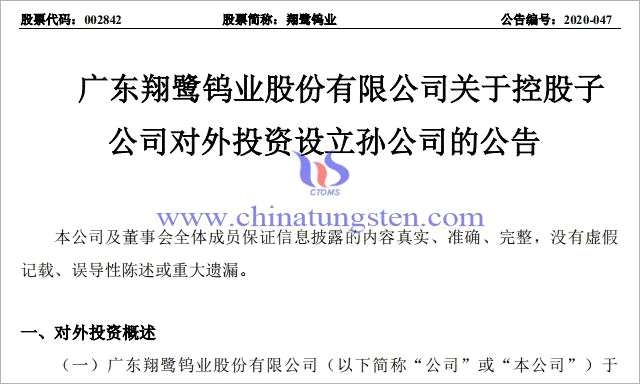 廣東【翔鷺鎢業(yè)(002842)、股吧】(002842)日前發(fā)布關(guān)于控股子公司對外投資設(shè)立孫公司的公告,其控股子公司廣東翔鷺精密有限公司擬以自有資金設(shè)立孫公司江西翔鷺精密制造有限公司,注冊資本為人民幣2億元,由翔鷺精密持有其100%股權(quán)。