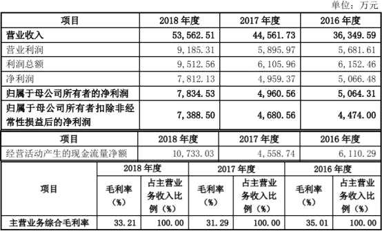 上市前,德恩精工業(yè)績波動,凈利潤先減后增。據(jù)招股說明書,2016年至2018年,德恩精工的營業(yè)收入分別為3.63億元、4.46億元、5.36億元;歸屬于母公司所有者的凈利潤分別為5064.31萬元、4960.56萬元、7834.53萬元;歸屬于母公司所有者扣除非經(jīng)常性損益后的凈利潤4474.00萬元、4680.56萬元、7388.50萬元;經(jīng)營活動產(chǎn)生的現(xiàn)金流量凈額分別為6110.29萬元、4558.74萬元、1.07億元;主營業(yè)務(wù)毛利率分別為35.01%、31.29%、33.21%。