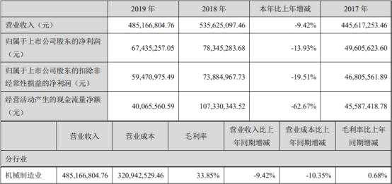 上市當(dāng)年,德恩精工業(yè)績變臉,營收和凈利下滑。2019年,德恩精工實(shí)現(xiàn)營業(yè)收入4.85億元,同比減少9.42%;歸屬于上市公司股東的凈利潤6743.53萬元,同比減少13.93%;歸屬于上市公司股東的扣除非經(jīng)常性損益的凈利潤5947.10萬元,同比減少19.51%;經(jīng)營活動產(chǎn)生的現(xiàn)金流量凈額4006.56萬元,同比減少62.67%;主營業(yè)務(wù)毛利率33.85%,比上年同期增長0.68個百分點(diǎn)。