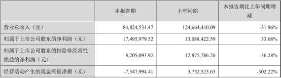 近日,【德恩精工(300780)、股吧】(300780)(300780.SZ)披露了2020年第一季度業(yè)績。2020年一季度,公司實(shí)現(xiàn)營業(yè)收入8482.45萬元,同比減少31.96%;歸屬于上市公司股東的凈利潤1749.60萬元,同比增長33.68%;歸屬于上市公司股東的扣除非經(jīng)常性損益的凈利潤820.51萬元,同比減少36.28%;經(jīng)營活動產(chǎn)生的現(xiàn)金流量凈額-754.80萬元,同比減少302.22%。