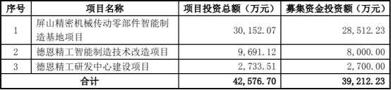 德恩精工上市時披露的公告書顯示,公司上市發(fā)行股份數(shù)量為3667萬股,募集資金總額為4.25億元,扣除發(fā)行費(fèi)用后募集資金凈額為3.92億元,分別用于“屏山精密機(jī)械傳動零部件智能制造基地項(xiàng)目”、“德恩精工智能制造技術(shù)改造項(xiàng)目”、“德恩精工研發(fā)中心建設(shè)項(xiàng)目”。